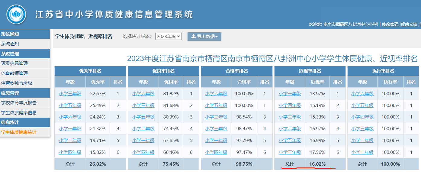 优秀率:26.02%,良好率:49.43%,优良率:75.45%,合格率:98.75%,近视率:16.02%。